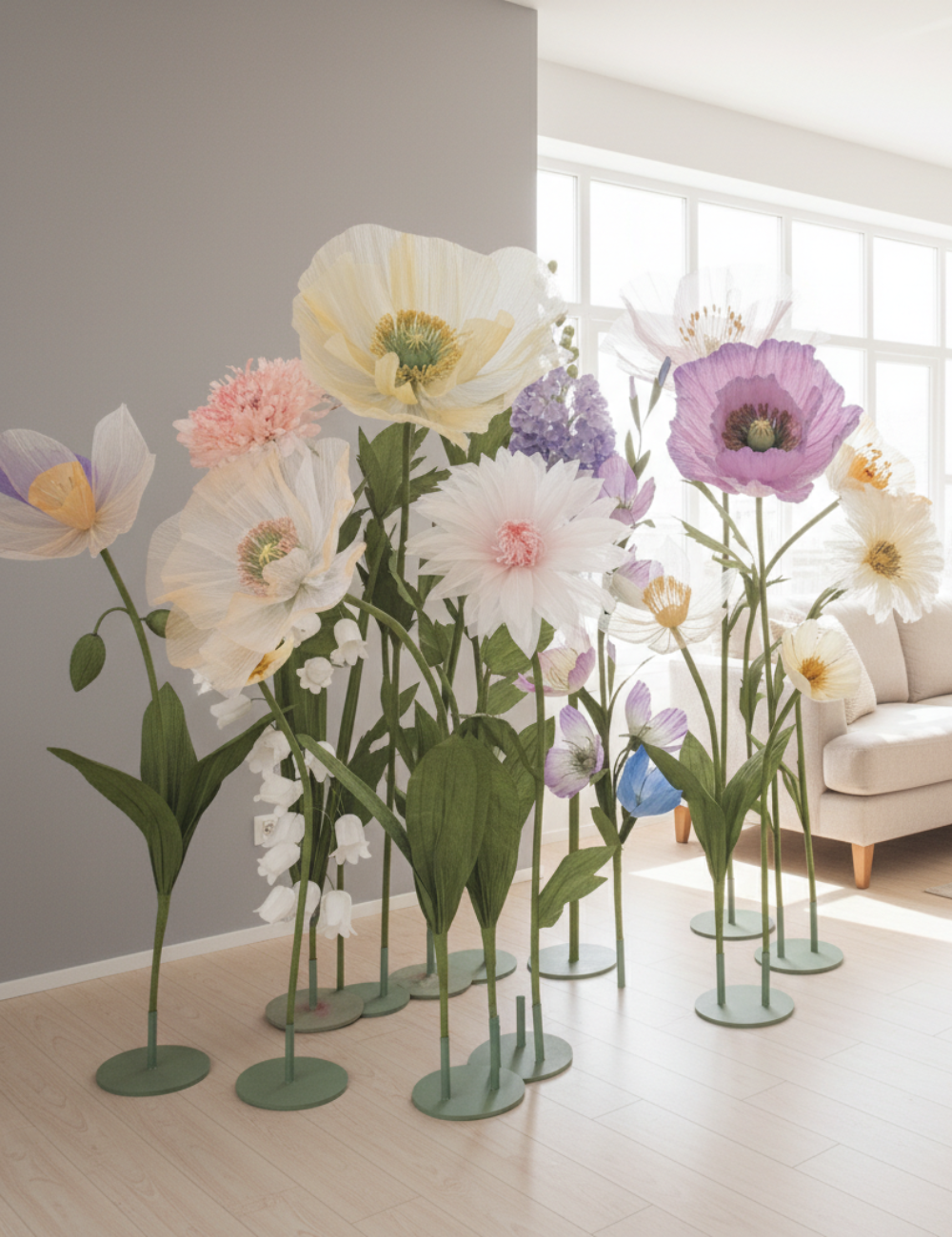 This light-colored paper flower arrangement features a staggered design with varying heights, creating a soft and natural overall look. It's perfect for wedding decorations, photography backdrops, or window displays, offering a light and sophisticated visual effect.~~~~~~~~~~~~~~~~~~~~~~~~~~~~~~