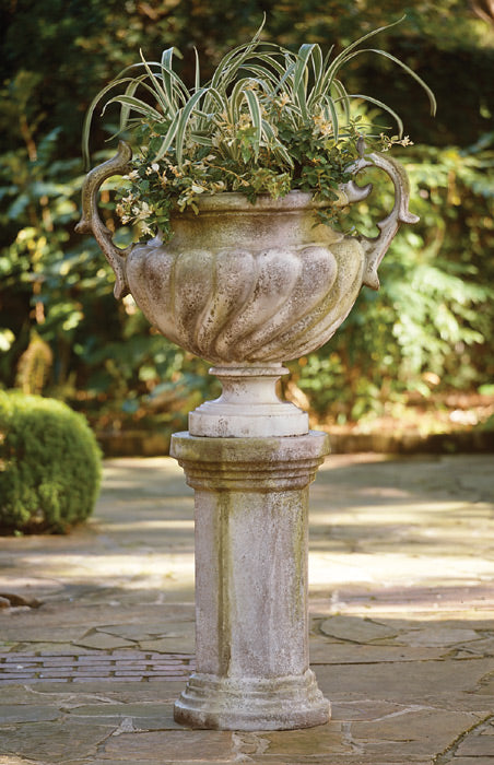 With the appearance of aged stone, our urn is made from a mixture of sand and stones cast into a surface using terrazzo-like techniques. The surface is then sandblasted and chemically treated (variations in color will occur). It is reinforced with a fiberglass backing. Lightweight yet durable, the urn and its pedestal may be left outdoors indefinitely. Made in the USA. Please choose your drainage hole preference from the boxes above.
