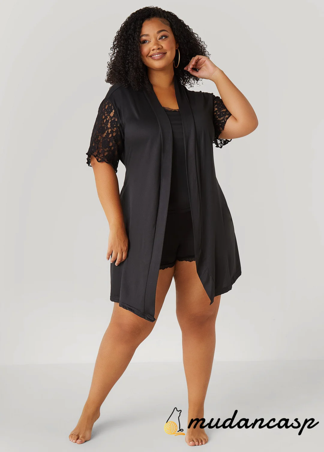 Sweet dreams start here. The Love To Sleep three-piece set includes a jersey cami with adjustable straps, bow details and lace trims, matching pull-on shorts with a comfy waistband and a lace-trimmed robe with sash-ties to top it all off.