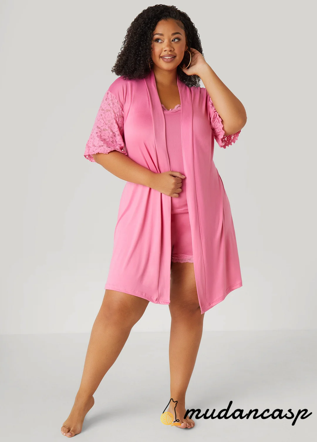 Sweet dreams start here. The Love To Sleep three-piece set includes a jersey cami with adjustable straps, bow details and lace trims, matching pull-on shorts with a comfy waistband and a lace-trimmed robe with sash-ties to top it all off.