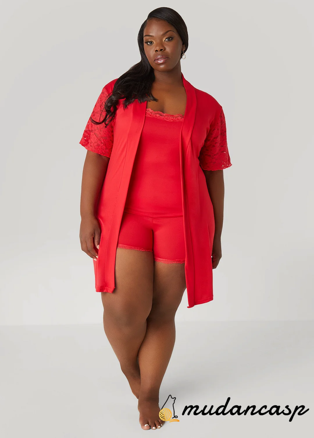 Sweet dreams start here. The Love To Sleep three-piece set includes a jersey cami with adjustable straps, bow details and lace trims, matching pull-on shorts with a comfy waistband and a lace-trimmed robe with sash-ties to top it all off.