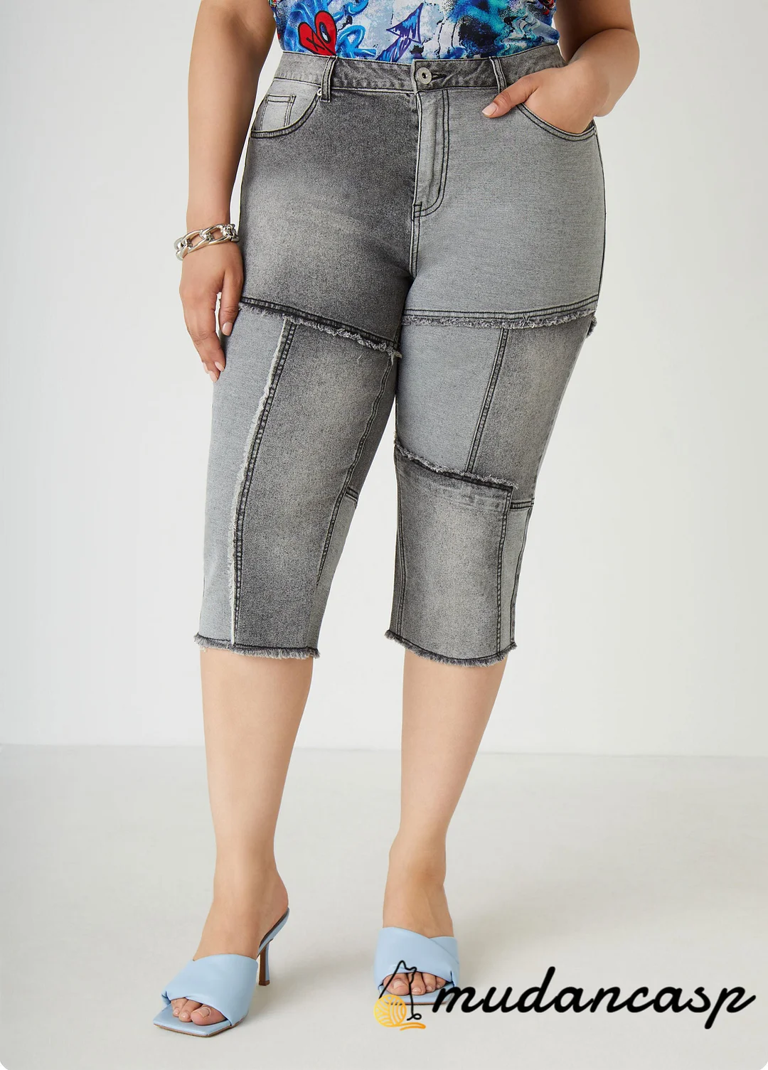 Let's make some commotion for these patchwork denim capris!!! Frayed with a high-waist, the fit flatters your style & shape.